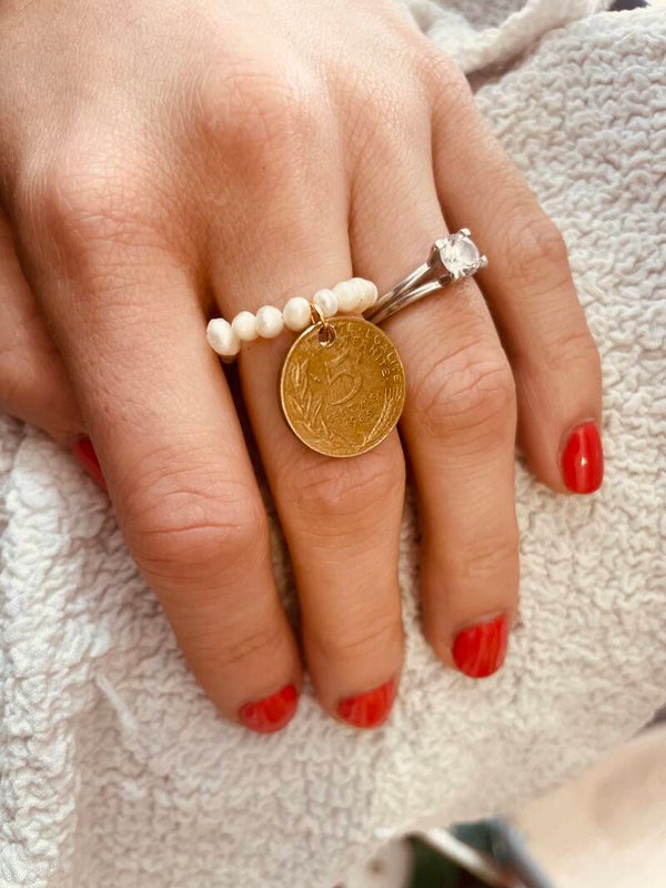 Cette bague en acier inoxydable, montée sur un fil élastique avec des perles en perle d'eau douce, elle conviendra à tous les doigts.