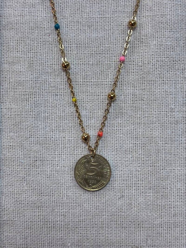 Une pièce de 5 centimes de francs avec laquelle on s'achetait des bonbons dans le temps autour de votre cou tel un bijou digne de grande dame.