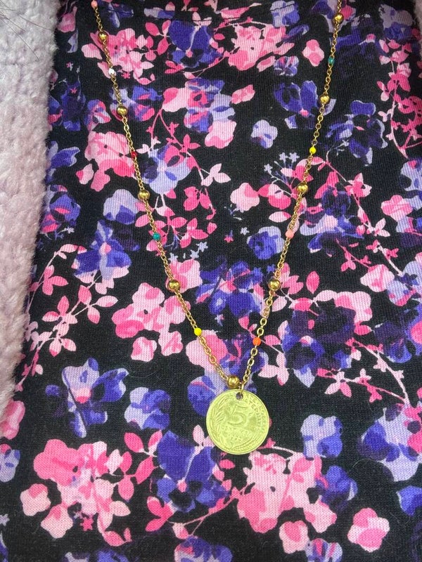 Accompagné de sa chaine en acier inoxydable ornée de petites boule colorées, ce collier est réglable.