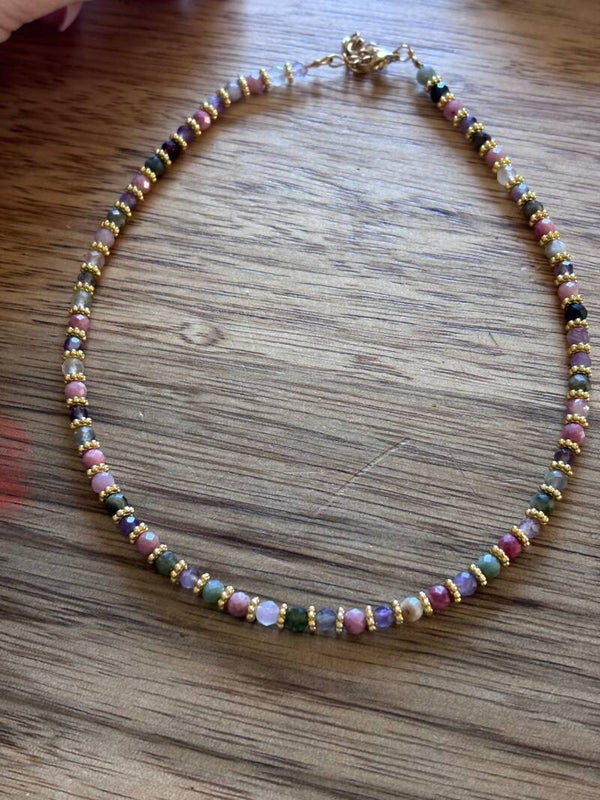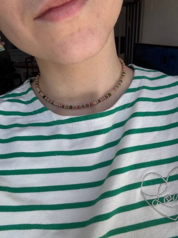 Avec ces petites fleurs entre chaques perles, vous allez acquerir un bijoux lumineux et unique fait main avec amour.