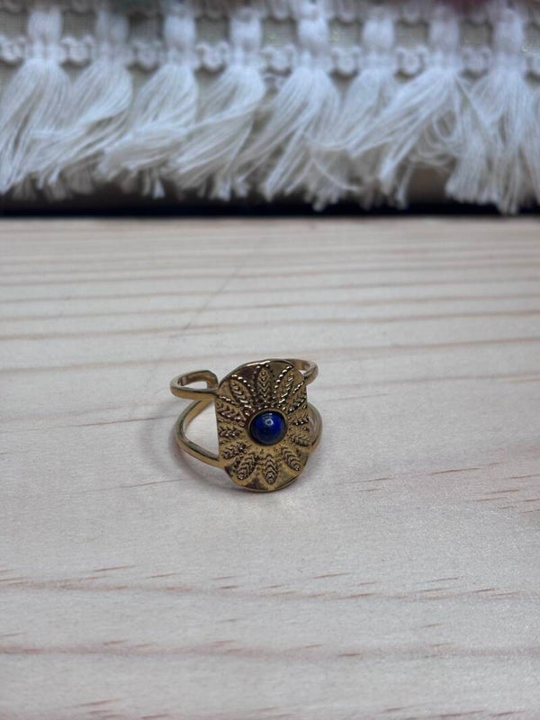 Une bague en acier inoxydable avec de petites plumes indiennes et un lapis-lazulis, pierre de la communication, qui aide aussi à la confiance en soi.