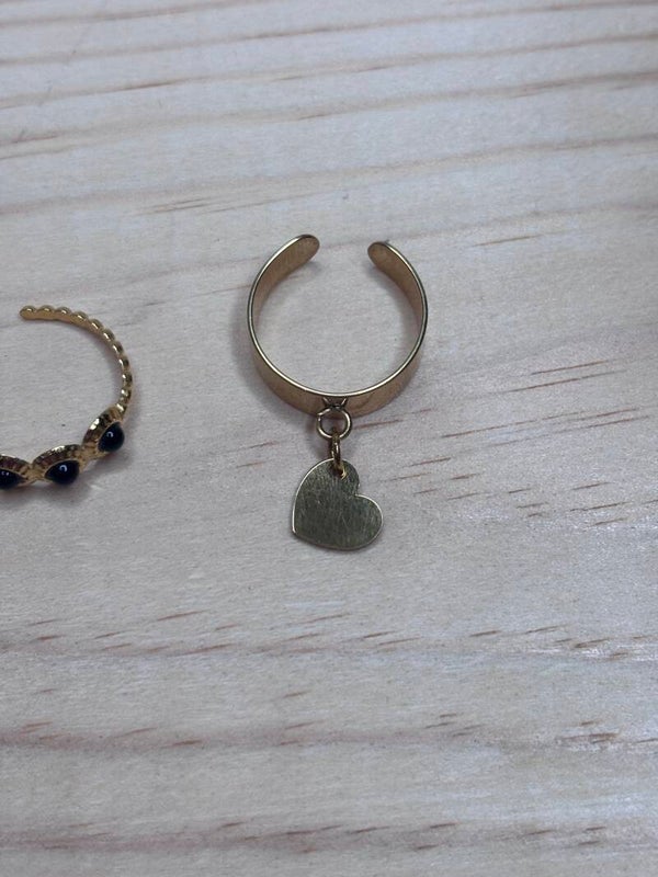Jolie bague avec coeur qui pend, tout en acier inoxydable et réglable.